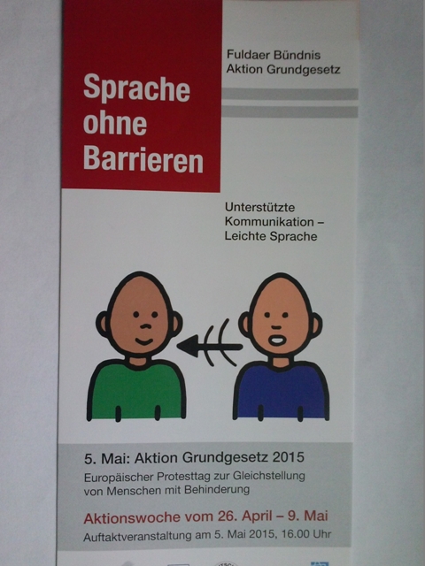 „Unterschiedliche Menschen feiern gemeinsam Gottesdienst, das ist Inklusion“ – so kommentiert Gemeindevorsteher Reinhard Eckey den Gottesdienst in Gebärdensprache am 26. April 2015 im Haus Oranien in Fulda. An diesem Sonntag ist die Gottesdienst-Gemeinde doppelt so groß wie sonst. Viele Interessierte sind gekommen, weil der Gottesdienst im Rahmen der ‚Aktion Grundgesetz‘ stattfand. In diesem Jahr hieß das Motto der ‚Aktion Grundgesetz‘: „Sprache ohne Barrieren.“ Wie kann das funktionieren, Sprach-Barrieren abzubauen? Welchen Beitrag kann die Gebärdensprache leisten? Das ist ein Thema für alle, die sich für barrierefreie Kommunikation interessieren. Deshalb war der Gottesdienst in Gebärdensprache Teil im Rahmen-Programm der ‚Aktion Grundgesetz‘.