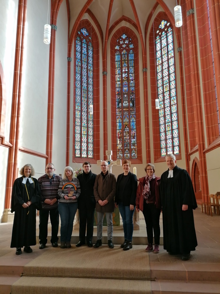 Stadtkirche am 15. Februar. Das Gebärdenkreuz wird auf den Altar gestellt. Das zeigt: Hier feiern die hörende und die gehörlose Gemeinde 1x im Jahr gemeinsam Gottesdienst. Dieses Jahr genau am Faschingssonntag: Bunt und fröhlich und mit großem Team. Pfarrer Heidelbach und Pfarrerin Bätzing haben den Gottesdienst gemeinsam gemacht. Marion Schleicher, Lehrerin an der Hermann-Schafft-Schule, hat gedolmetscht. Ingo Kloss und Klaudia Geisel haben Theater gespielt: Jesus hilft uns, die Welt mit Freude und Hoffnung zu sehen: Motto: „Los jetzt und die Augen auf! Wir ziehen mit Jesus und es geht bergauf!“ (Lukas 18).